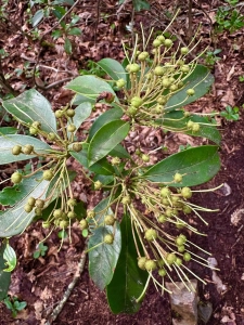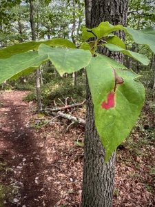 Black gum (aka sour gum and black tupelo) grows commonly from northern Pennsylvania deep into Alabama. The photo at left demonstrates the species’ tendency for lateral branches to extend at right angles to the bole. An insect injury on the leaf at right has discolored the leaf spot to its distinctive autumn red.