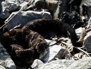 We saw two timber rattlesnakes sunning near the dam, this one more exposed than the other, a yellowish variety. The beautiful individual, sporting nine rattle buttons, kept its head behind a rock. I wanted a better image, yet not enough to stumble over the stones for a full-length image!