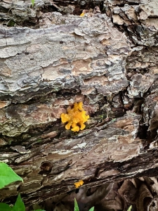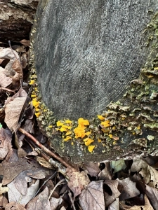 Orange jelly or orange witch’s butter (Dacrymyces chrysospermus) is a species of jelly fungus that grows on dead pine wood. Trail crews bucked the fallen pine to clear the trail, I’m estimating within the past two years. Already the fungus has infected the wood and is now producing spores to secure the future, a goal embraced by all organisms.