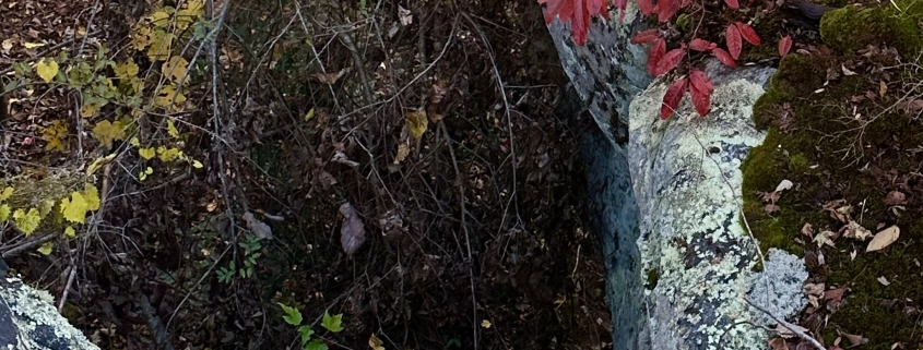 Come along with me to see the beauty, magic, wonder, and awe I spotted. The lodge deck overlooking the canyon of the West Fork of the Little River proved a good place to begin my trek. A brilliantly red sourwood tree stood at eye level, peering through the now-leafless yellow poplar (left). A smaller sourwood shrub topped a sandstone ledge near the deck (right). As a run-of-the-mill guy who knows only the basic rainbow colors, I referred to sourwood’s fall cape simply as red. Online leafyplace.com relied on more color-proficient descriptors: vibrant shades of crimson red to burgundy and purple.